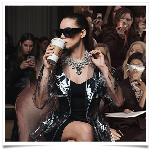 Assise à côté de moi, à la collection de Valentino, elle arriva avec son café cappuccino, qui coûte le prix d’un sac Zara édition limitée, qu’elle sirotait, et me dit, en montrant le gobelet, un matcha sans matcha (concept expérimental du moment). Pour lire plus cliquer ici
