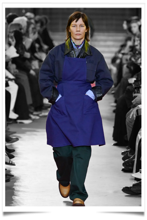 Il fallait bien que le retour de la concierge espagnole signée Prada arrive un jour ! Ainsi, après avoir libéré les corps, Miuccia veut enfermer les corps dans des uniformes de service, et au passage, la mode y a glissé aussi les esprits bien serrés comme dans un sac de linge sale… Les vêtements de travail, naguère symboles d’effort et de sueur, deviennent à présent des parures de dévotion domestique. Pour lire plus cliquer ici
