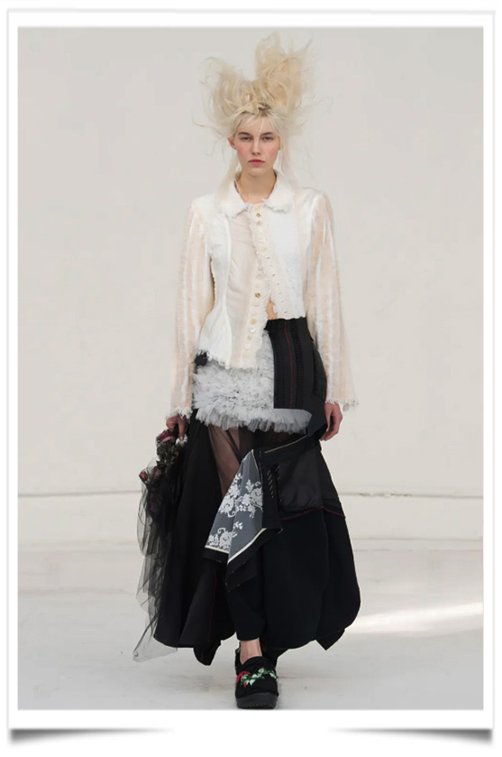 Pour fêter ses vingt ans de carrière, Erdem Moralıoğlu propose un mélange des genres si extravagant qu’on aurait juré voir Madame de Pompadour draguer un punk dans un club post-industriel, sous une boule à facettes en cristal de Bohême. Dans un monde où l’économie ressemble à un corset trop serré, sa persistance à la couture relève de l’héroïsme romantique. Londres, toujours prête à applaudir ses enfants prodiges, l’a regardé comme on regarde un alchimiste transformer l’angoisse en broderie. Pour lire plus cliquer ici