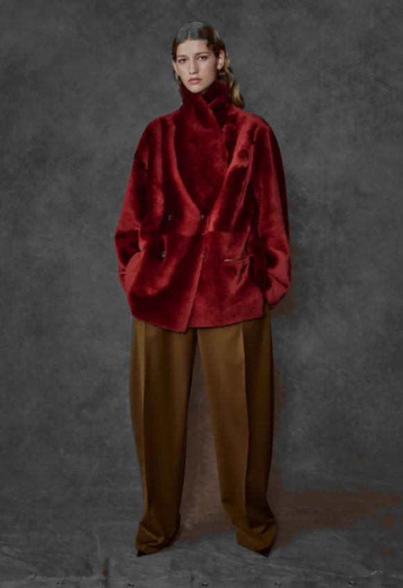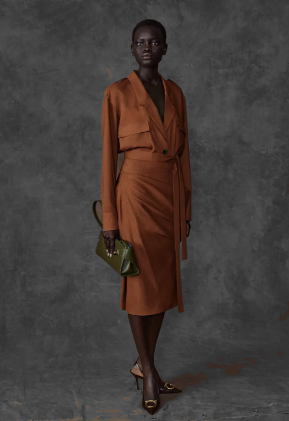 Sa collection, elle, n’avait rien d’aussi placide. On y sentait une volonté obstinée de rappeler que la beauté, quand elle veut bien, sait encore se battre. Il y avait cette veste réversible en peau lainée, bordeaux profond comme un secret qu’on ne confie qu’à la tombée du soir, et ce trench souple qui avançait avec l’assurance silencieuse des choses bien faites. Une saharienne en daim vert militaire pour les hommes désireux de feindre la recherche d’une conquête, des robes drapées en laine légère qui semblaient tenir debout par la seule persuasion de leur élégance, et ces ensembles en crêpe où des nœuds de cuir murmuraient qu’il existe encore des détails capables de sauver une journée.