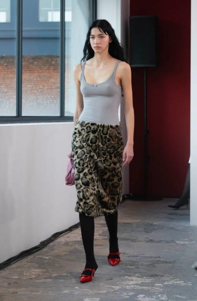 Le défilé s’est tenu à la Fondazione ICA Milano, temple milanais de l’art contemporain, où les mannequins glissaient entre les invités et les toiles vibrantes de Marina Rheingantz. Les peintures semblaient observer ces chats imprimés avec un air entendu, comme si l’abstraction elle-même avait décidé de ronronner.