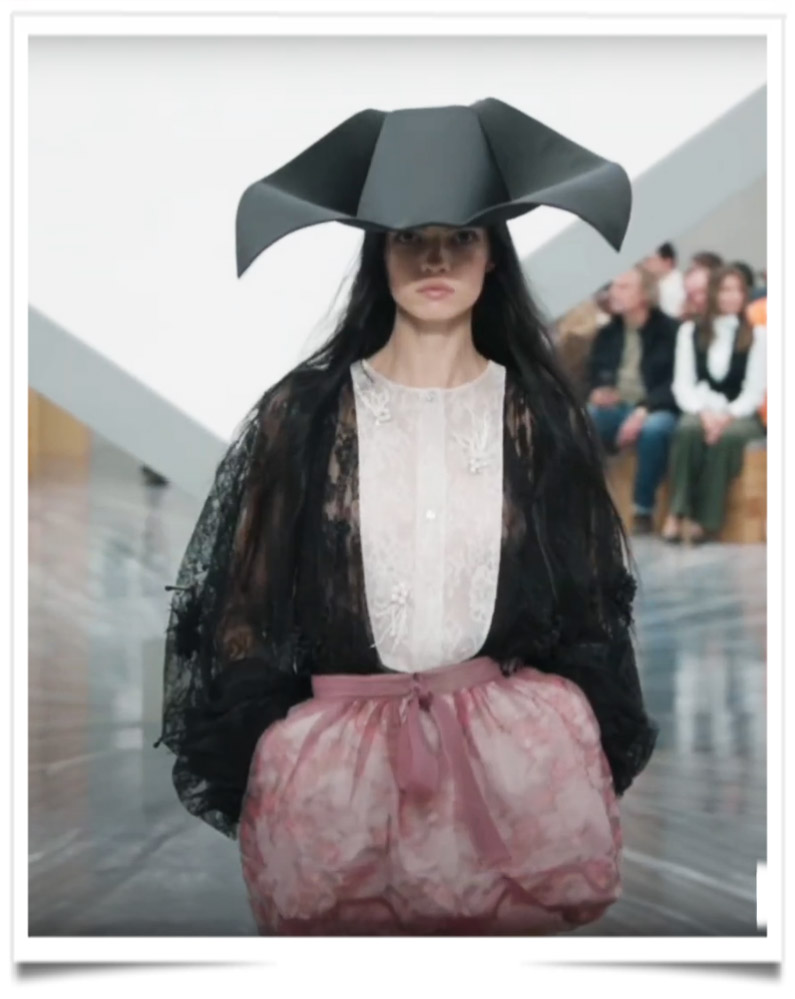 Alors naquirent les robes : elles surgirent une à une, avec la gravité d’un rite, sous la main d’Anderson, ce Britannique plus britannique que sa patrie. Chaque couture semblait une prière cousue au fil d’or. Les cornettes de nonne, et les tricornes revisités, tout droit sortis du siècle de Voltaire, donnaient un air religieux. au défilé. Les nœuds posés comme des stigmates sur les corps évoquaient une liturgie, sorte de religion nouvelle, où l’aiguille tenait lieu de crosse et le mannequin de pénitente devant l’homme de Tolède. Anderson écrivait avec ses étoffes un Évangile de chair et de soie, un chapitre neuf dans le livre sacré de Monsieur Dior.