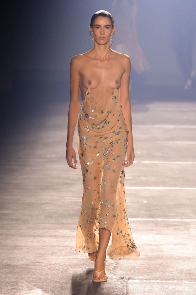Il y eut aussi des instants où un océan de beige, comme un souvenir de ses jours passés sous l’étendard de Max Mara. Mais l’artiste plonge dans la braise d’une transparence, l’éclair d’une lingerie, ou la provocation d’une robe-rideau pendue aux mamelons, perles incarnadines du mannequin. La maison Mugler, désormais entre les mains d’un empire de parfums, cherchait des éclats pour le tapis rouge, pour les regards des foules, pour la gloire immédiate des images. Miguel l’a compris : il a donné du faste, du panache, que réclame notre siècle impatient.