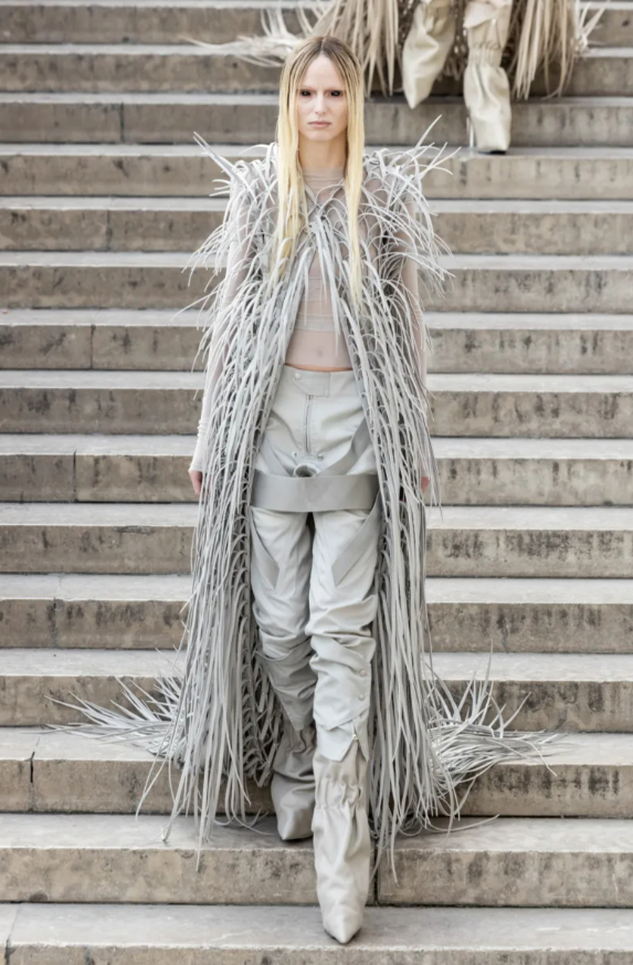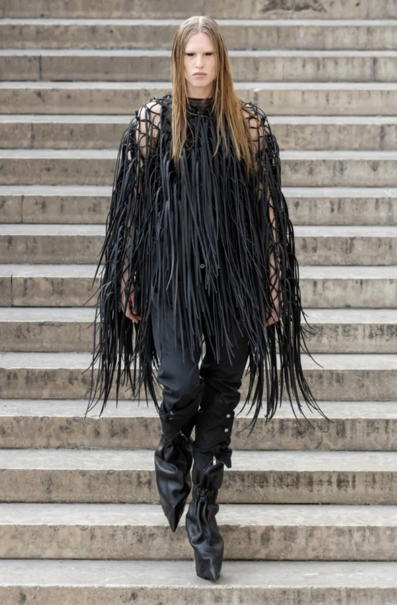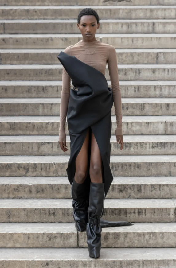 Le cortège d’Owensgroupises sagement en file indienne, attendant leur oracle, et lui, fidèle à sa singularité farouche, ses mannequins se sont avancés sur les eaux dormantes des bassins du Palais de Tokyo, comme une procession antique traversant un miroir d’azur. Figures hiératiques et drapées de hardiesses modernes, elles portaient des bottes pantalons si hautes qu’elles feraient pâlir la Burj Al Arab. Ainsi l’onde des jupes accueillait le vent des voiles pour naufragées.