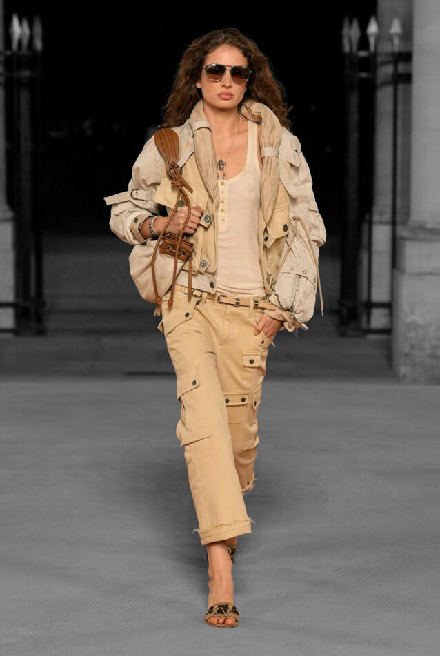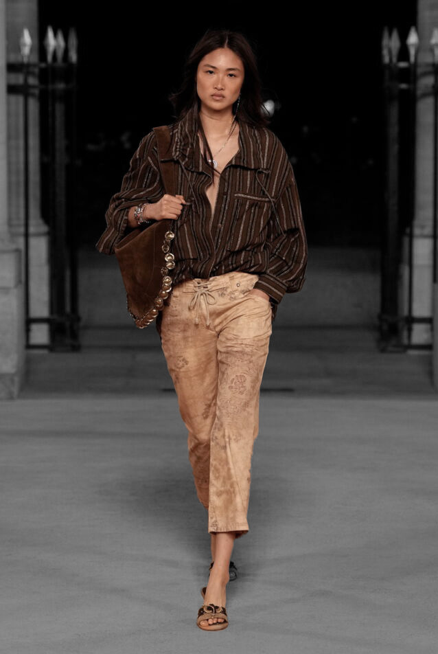 Pour cette héroïne du désert, Isabel Marant a tissé des armures embrasées, des chemises diaphanes qui se dissipent comme des mirages au bord de l’infini. Des totems de verre et de métal battent contre sa poitrine, échos des civilisations englouties, amulettes d’une tribu antique ressuscitée pour une nuit. Alors, sous l’incandescence du Palais Royal, Paris s’abolit : la pierre se fit poussière, la cour d’honneur se changea en steppe embrasée, et la ville, vaincue, s’inclina devant l’ardeur du désert.