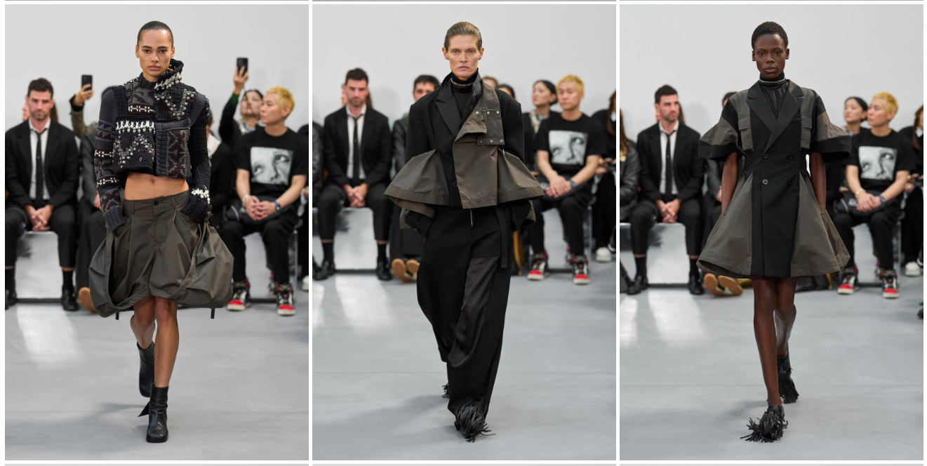 Dans sa demeure parisienne où respire le silence, Chitose Abe a entrouvert les portes du printemps. Un souffle doux, venu d’Orient, s’y est glissé, et les étoffes, dociles à sa main, ont pris vie. Les ensembles de jean ont emprunté la tendresse du vent, les t-shirts, la légèreté des songes. Un simple débardeur, prière de coton, s’est orné de jais, comme si la nuit elle-même s’était posée sur l’aube.