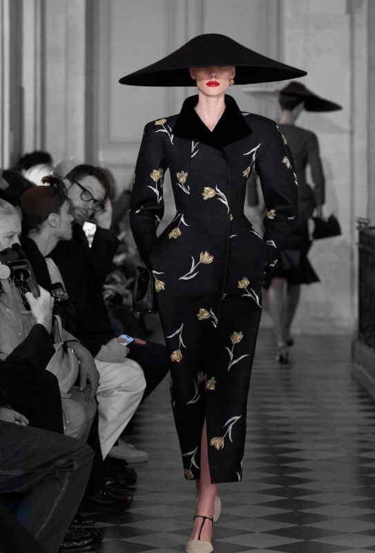 Jacquemus revisite le « New Look » de Dior sur la croisette du musée Picasso en le cosmétisant, enfin bref en le citant. Ses équipes exécutent pendant que lui orchestre, car il ne coud pas le petit « Salo nnais », il ne dessine pas, mais sait très bien pointer. Les boucles d’oreilles empruntées à Schiaparelli comme deux pinces de crabe passent pour un hommage, ainsi que le manteau rouge qui devient soudain un « clin d’œil », comprenez : une révérence opportune à la mort de Valentino. Chez Jacquemus, tout est référence, rien n’est d’origine, et l’émotion sert surtout de vernis conceptuel.