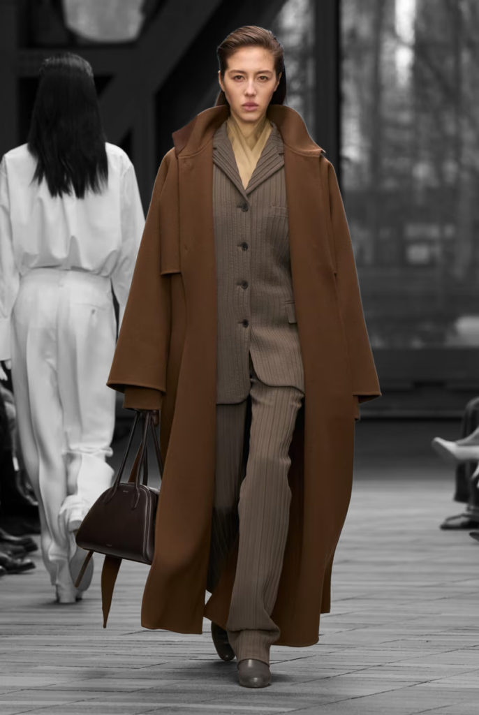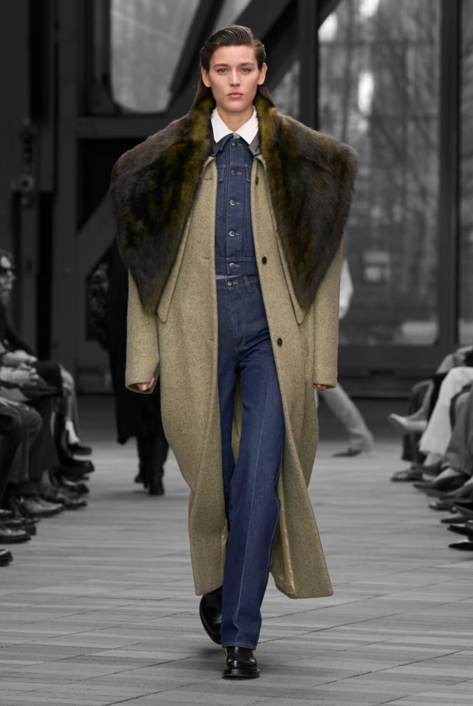 Manteaux à cols en fourrure, robes en drap de laine, costumes nets : les silhouettes jouent sur des contrastes subtils et des détails de coupe précis, comme des cols montants ou des trenchs à double épaisseur. La coupe met en valeur le corps, les bras et surtout les dos, révélant un minimalisme faussement simple.