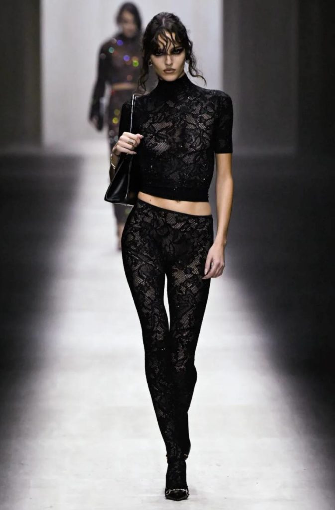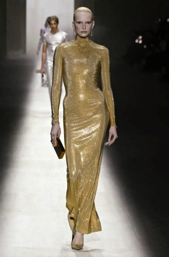 Le retour de Karlie Kloss et de Kate Moss en clôture avait la saveur d’un champagne millésimé qu’on croyait disparu de la cave. Robe noire dos nu, vertige textile, et ce string GG en or blanc serti de diamants, clin d’œil incandescent à l’époque Tom Ford une époque où la maison respirait le désir comme un parfum capiteux, dense, presque interdit.
