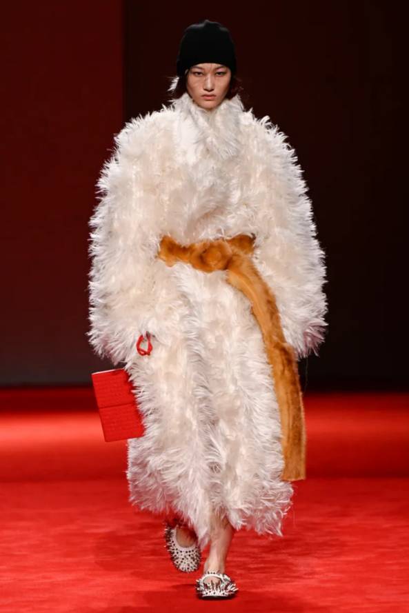 Naturellement, un tel raffinement a son prix. Un manteau trapèze bouclé, composé de plus de deux mille pièces de peau lainée, prouvait que la patience est la plus luxueuse des matières premières. Il faut beaucoup de fragments pour fabriquer une illusion d’unité, et encore plus pour qu’elle paraisse naturelle.