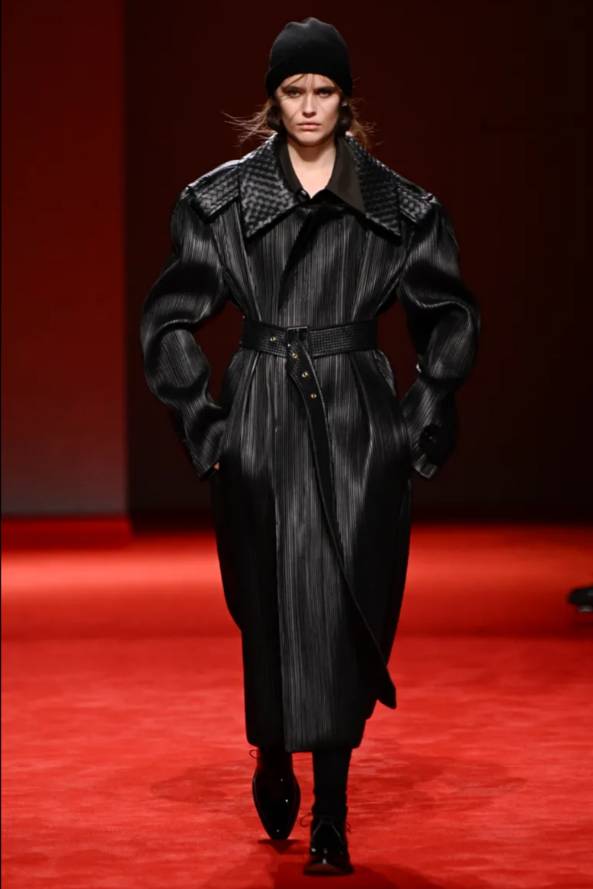 La variété des textures a été révélée par un somptueux manteau enveloppant qui se hérissait sur sa surface de milliers d’allumettes comme si elles venaient y mourir héroïquement. Un Trench en cuir, finement strié, rappelait la réglisse, et chaque pièce semblait murmurer que la matière n’est jamais innocente, qu’elle possède un tempérament, et parfois même, des ambitions.