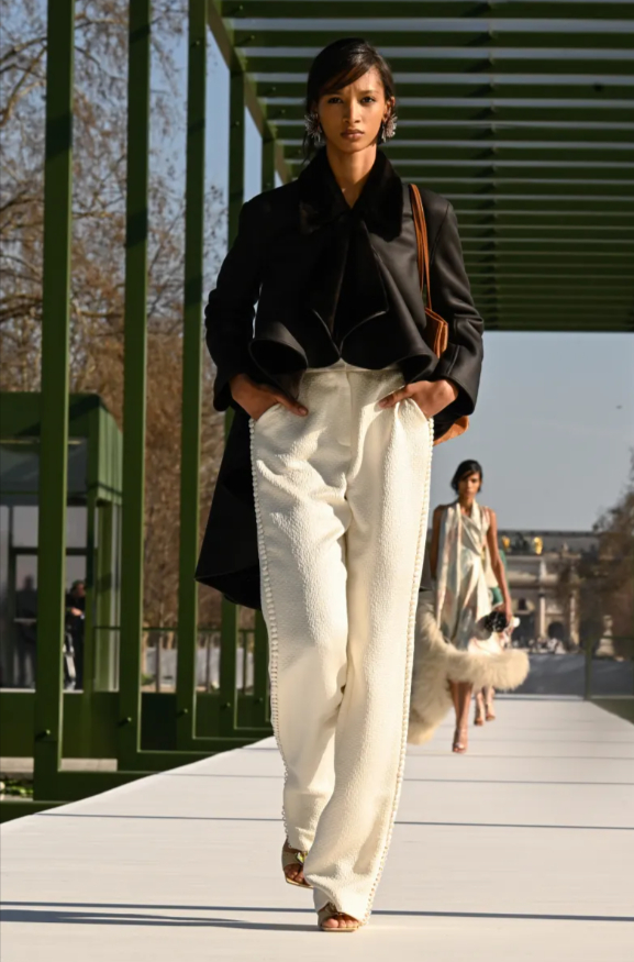 Puis, dans un geste presque ironique, apparurent les nouveautés dites accessibles : un pantalon de survêtement en soie martelée ivoire, orné de boutons recouverts façon robe de mariée, un jean brodé de rubans, fragile comme une promesse, des manteaux robes, simples et assumés, portés sans effort, déjà présents dans les boutiques de Dior mais désormais élevés au rang de déclaration publique. La démocratisation, ici, ne criait pas. Elle murmurait avec distinction.