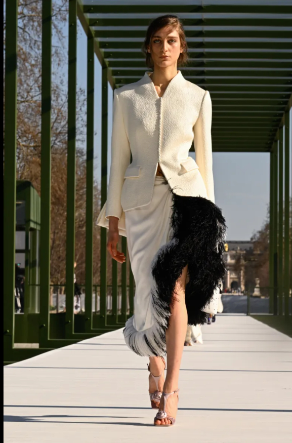 La veste Bar, icône disciplinée de la maison, renaissait en tweed Donegal : allongée, ajustée, maîtrisée. Tout devenait plus léger, presque aérien. La silhouette se précisait sans se figer, elle avançait, libre, refusant d’être capturée par une définition définitive.