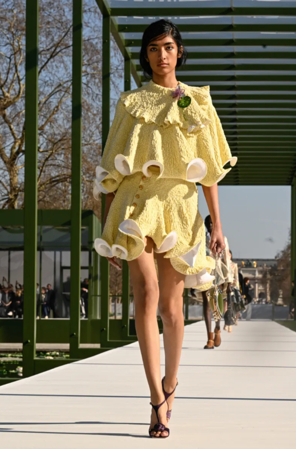 L’esprit du XVIIIe siècle, ce grand dramaturge poudré, planait sur les redingotes déstructurées, les jupes à tournure dessinaient des arabesques dans des tons amande. La dentelle de Chantilly s’étirait comme un souvenir précieux. Les jacquards métallisés captaient la lumière avec la gourmandise d’un miroir narcissique. Voici donc une collection, plus printanière que prévue, des jupes à volants virevoltaient comme des tutus décidés à prendre le pouvoir. Les volumes s’arrondissaient avec la douceur d’une confidence murmurée. Rose bonbon, jaune poussin, écru, bleu ciel… Une palette qui évoquait un confiseur du XVIIIe siècle reconverti en poète créateur de mode à la Jacques Mumuse.