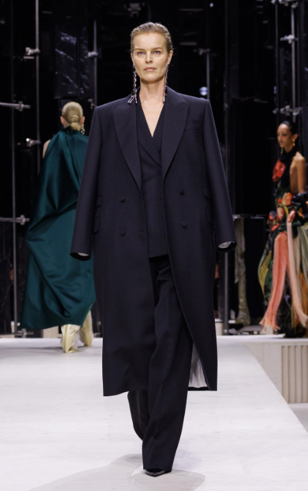 Alors passa Eva Herzigová avec la démarche de la certitude des héroïnes qui traversent les romans et les saisons. Sur ses épaules reposait un pardessus masculin, jeté avec cette négligence souveraine qui est parfois la forme la plus subtile de l’élégance. Dessous brillait la ligne impeccable d’un smoking, aussi précis qu’une phrase de Chateaubriand.