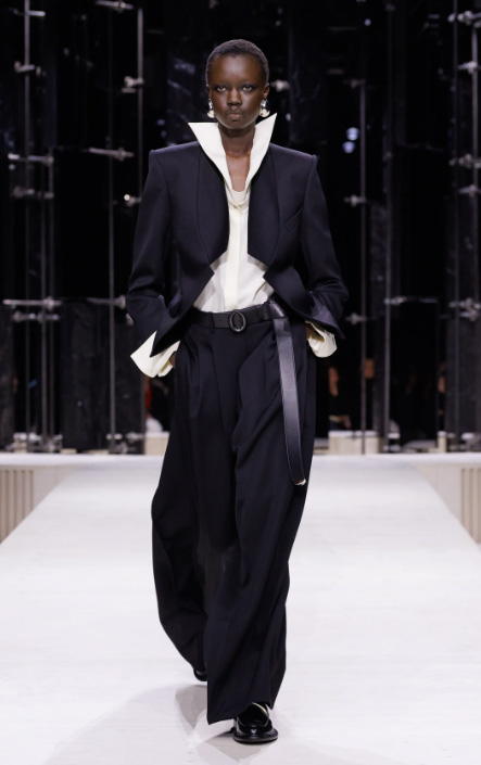 Un podium serpentait dans l’espace tel un sentier perdu dans le brouillard. Il cachait les silhouettes jusqu’au dernier instant, et chaque apparition surgissait comme un mirage né de la pénombre. On croyait voir naître une vision, puis une autre, comme si la mode elle-même chuchotait.